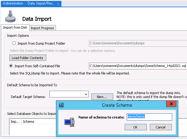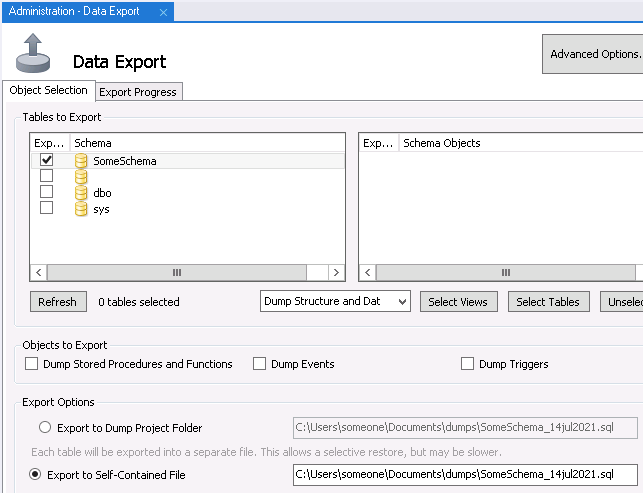 • Select “Export to Self-Contained File” as I wanted all the tables