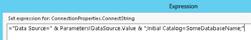 Then within the Data Source Properties I chose ‘build’ with a (temporary) static server name to get the login configured (which needs to be the same on both servers). Then amended the connection string by choosing ‘fx’ to construct something like this …